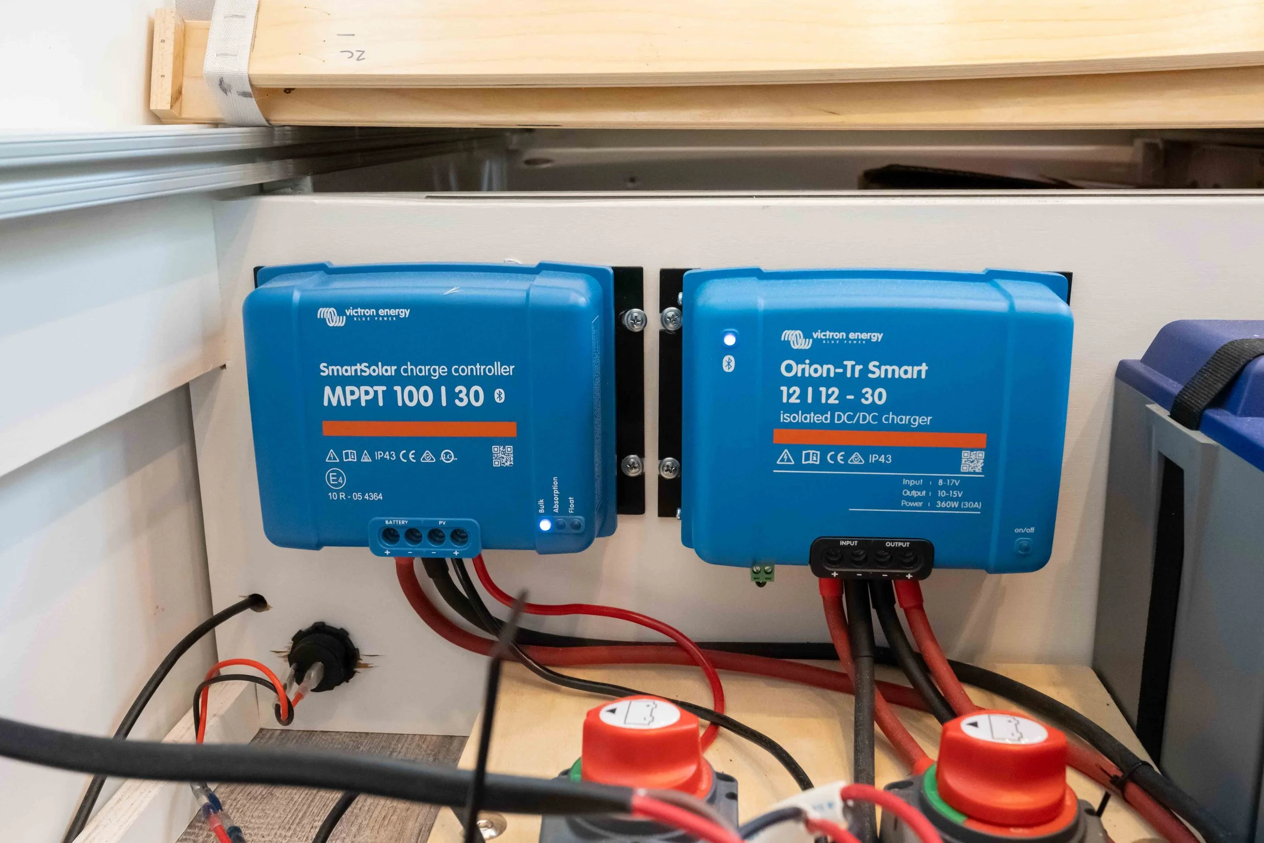 The ability to draw a strong charge from both the solar panels and the van’s alternator means that the battery bank’s state of charge very rarely goes below 60% with fairly heavy usage.