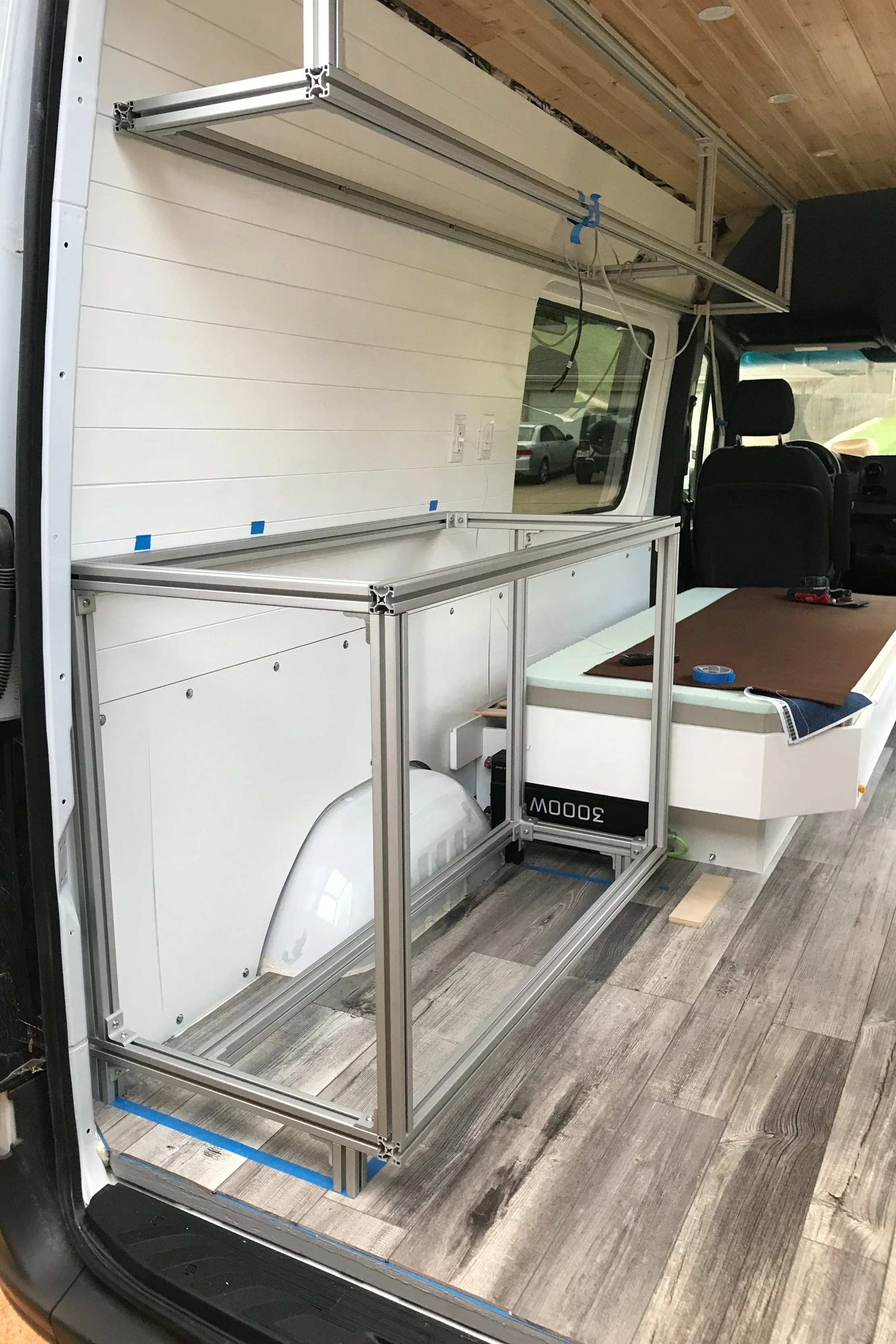 The galley and cabinetry are solidly built with 80/20 extruded aluminum and securely bolted to the van body in multiple places. This ensures longevity of components, keeps the vehicle weight much lower, and is significantly safer for vehicle occupants.